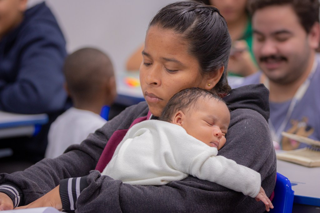 A professora, de frente para o quadro, consegue enxergar uma diversidade na turma. São mulheres e homens e todas as idades e etnias, a maioria venezuelanos, haitianos, egípcios e afegãos. Muitos chegam de uniforme do trabalho, com os filhos pequenos no colo. Na carteira, com as folhas das atividades avaliativas, as crianças preenchem junto com os pais as questões. No meio do grupo, estava a venezuelana Rima el Khuffach da Silva. O sotaque da língua espanhola não a impediu de expressar a felicidade por aprender o Português. “Eu tô gostando muito, muito, muito”, disse sorrindo.
